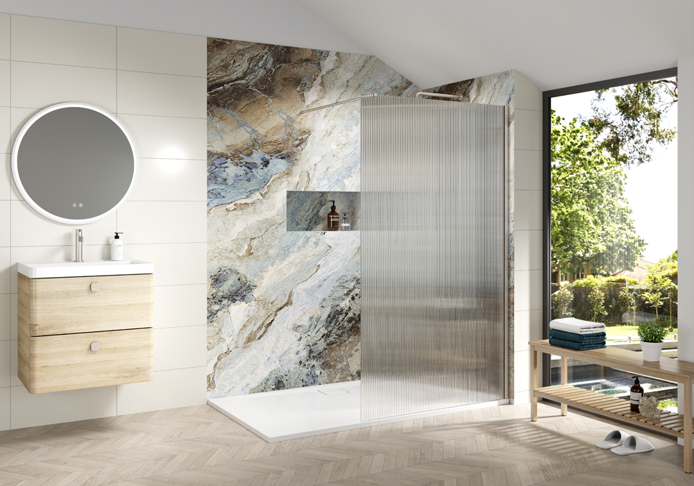 Merlyn 8mm Wetroom Panel Fluted Glass Brushed Bronze Profile 800mm (Inc. bracing bar & t – piece)